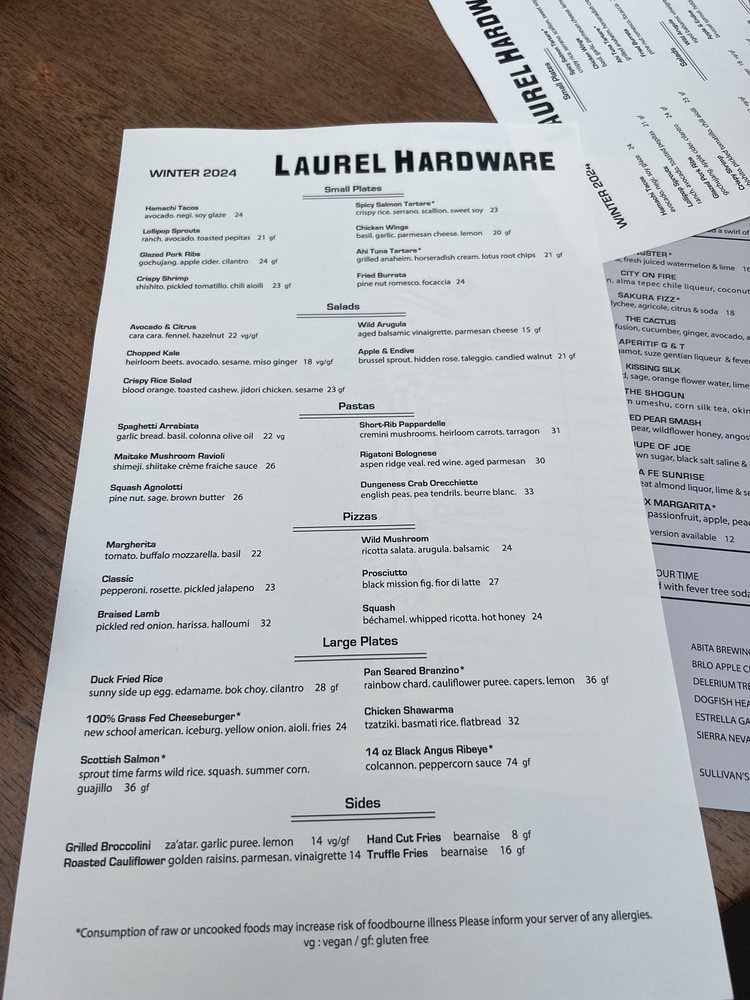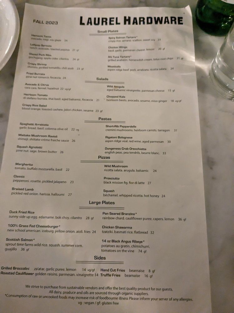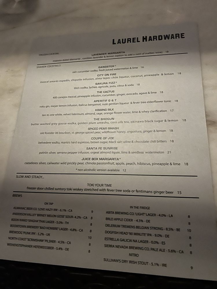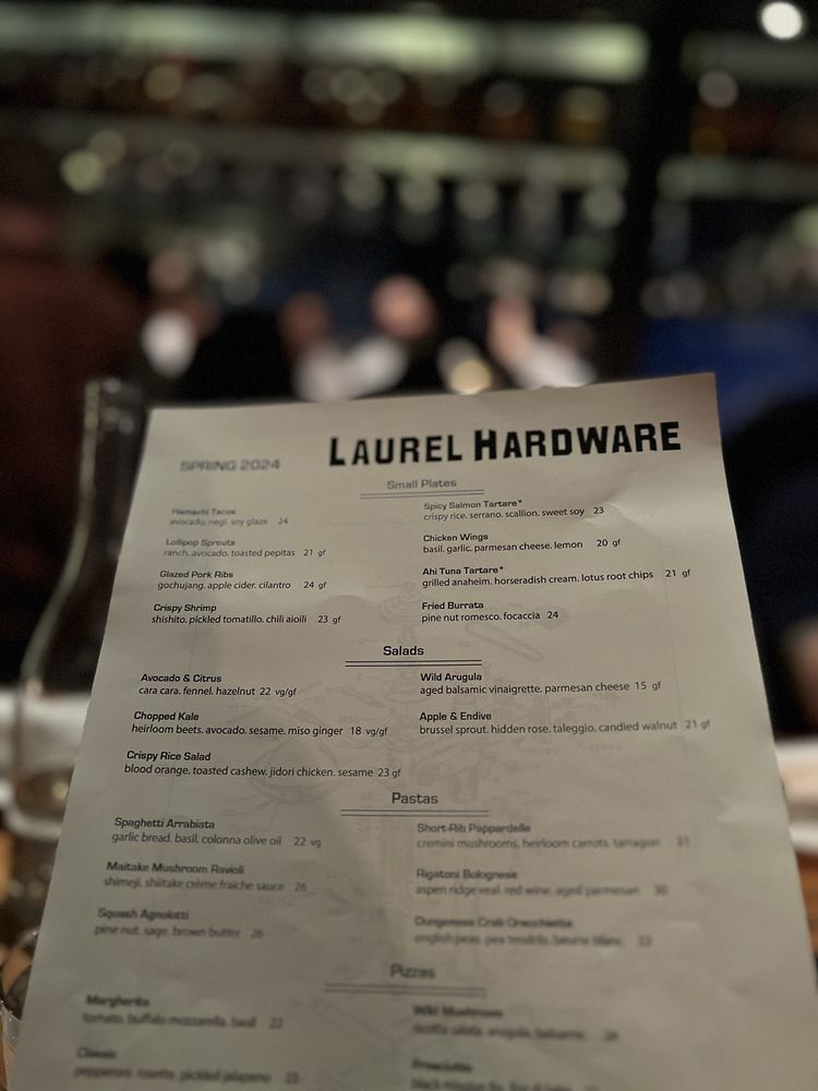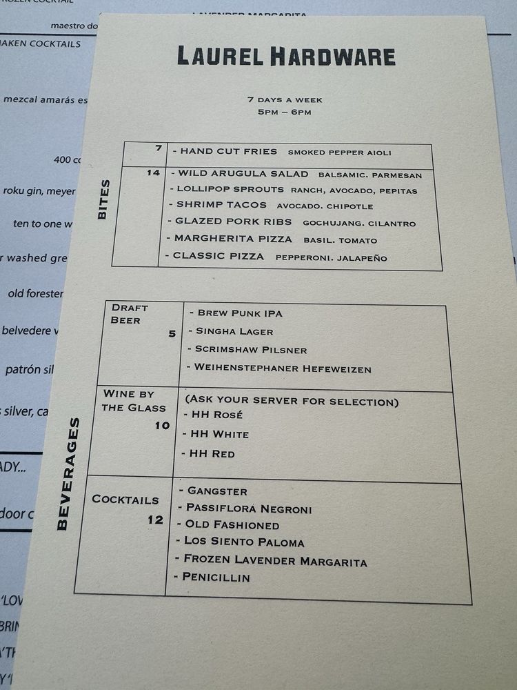 Introducing the menu at Laurel Hardware, a trendy New American bar in West Hollywood. This hot spot offers a variety of vegan and vegetarian options, alongside a full bar and happy hour specials. Customers rave about the arugula salad, crispy shrimp, and unique lavender margarita. The outdoor seating, complete with tree lighting, adds to the enchanting atmosphere. The attentive service and high-energy vibe make it a top choice for a night out. Standout dishes include the short rib pappardelle, lamb halloumi pizza, and wings coated in a basil, lemon, and cheese mix. The restaurant excels in providing a balance of flavors, generous portions, and impeccable presentation. Laurel Hardware is a must-visit for those seeking a memorable dining experience in LA.